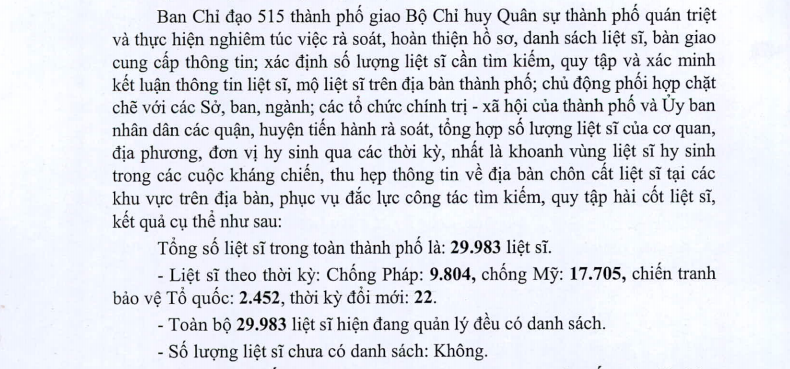 Trên cơ sở tổng hợp kết quả kết luận địa bàn phục vụ lập bản đồ tìm kiếm, quy tập hài cốt liệt sĩ của các quận, huyện. Ban Chỉ đạo 515 thành phố Hải Phòng đã có báo cáo số 315/BC-BCĐ ngày 4/10/2019 về kết quả rà soát, kết luận thông tin liệt sĩ, mộ liệt sĩ trên địa bàn thành phố.