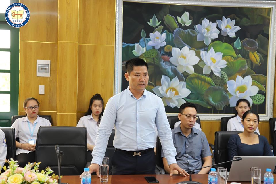 Đại diện lãnh đạo nhà trường, cô Mai Thị Huệ – Phó Hiệu trưởng nhà trường đã phát biểu cảm ơn doanh nghiệp và khẳng định mối quan hệ giữa Doanh nghiệp và Nhà trường là hai chủ thể không thể tách rời. Tất cả hoạt động của nhà trường hướng đến người học, và doanh nghiệp sẽ cùng đồng hành với nhà trường trong việc đào tạo ra nguồn nhân lực có tay nghề, có thực tiễn ngay từ khi còn ngồi trên ghế nhà trường; sản phẩm đào tạo chính là nhân lực có năng lực, trình độ tay nghề và thái độ ứng xử nghề nghiệp chuẩn mực. Phó Hiệu trưởng nhà trường cũng khẳng định nhà trường đã lựa chọn và tin tưởng giao nhiệm vụ cho 28 sinh viên được lựa chọn từ hơn 500 sinh viên từ hệ cao đẳng của Nhà trường sẽ là những chiến binh hoàn thành tốt, hoàn thành xuất sắc nhiệm vụ thực tập tại doanh nghiệp. Cô tin rằng nhóm thực tập tại M’Gallery sẽ sớm khẳng định và có vị trí việc làm tốt, chất lượng ngay sau khi tốt nghiệp.