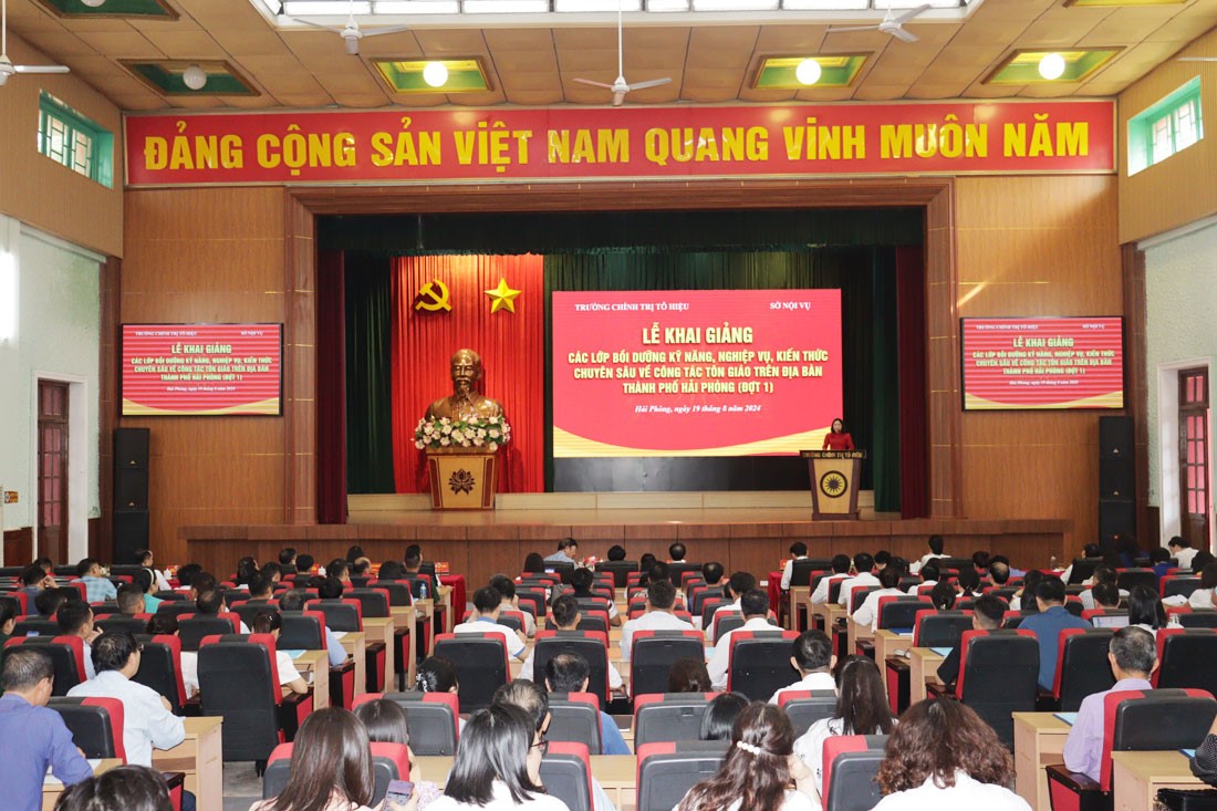 Sáng 19/8, Trường Chính trị Tô Hiệu tổ chức Lễ khai giảng các Lớp bồi dưỡng kỹ năng, nghiệp vụ, kiến thức chuyên sâu về công tác tôn giáo trên địa bàn thành phố (đợt 1) năm 2024. Tới dự có các đồng chí: Lê Trí Vũ, Ủy viên Ban Thường vụ Thành ủy, Trưởng Ban Tổ chức Thành ủy; Nguyễn Kim Pha, Hiệu trưởng Trường Chính trị Tô Hiệu; Đỗ Tràng Thành, Phó Chủ tịch Ủy ban MTTQ Việt Nam thành phố; lãnh đạo Ban Tôn giáo, Sở Nội vụ.