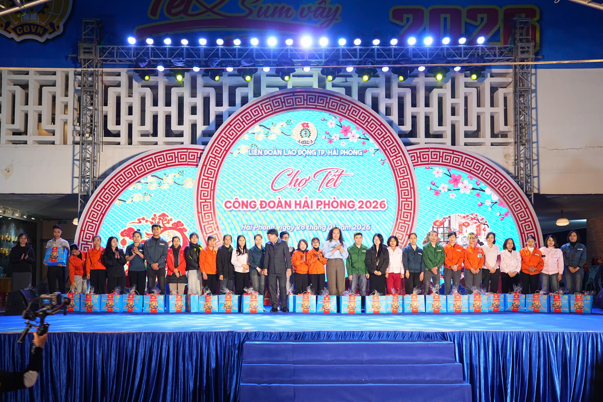 Trong khuôn khổ Chương trình “Tết Sum vầy – Xuân ơn Đảng” năm 2026, LĐLĐ thành phố trao 3.000 suất quà, mỗi suất trị giá 500.000 đồng, kết hợp các hoạt động giao lưu, văn nghệ, tạo không khí đầm ấm, gắn kết đoàn viên, người lao động; đồng thời trao 5.000 voucher mua hàng trực tiếp tại Chợ Tết Công đoàn Hải Phòng, trị giá 200.000 đồng/voucher, nhằm hỗ trợ thêm chi phí mua sắm Tết.