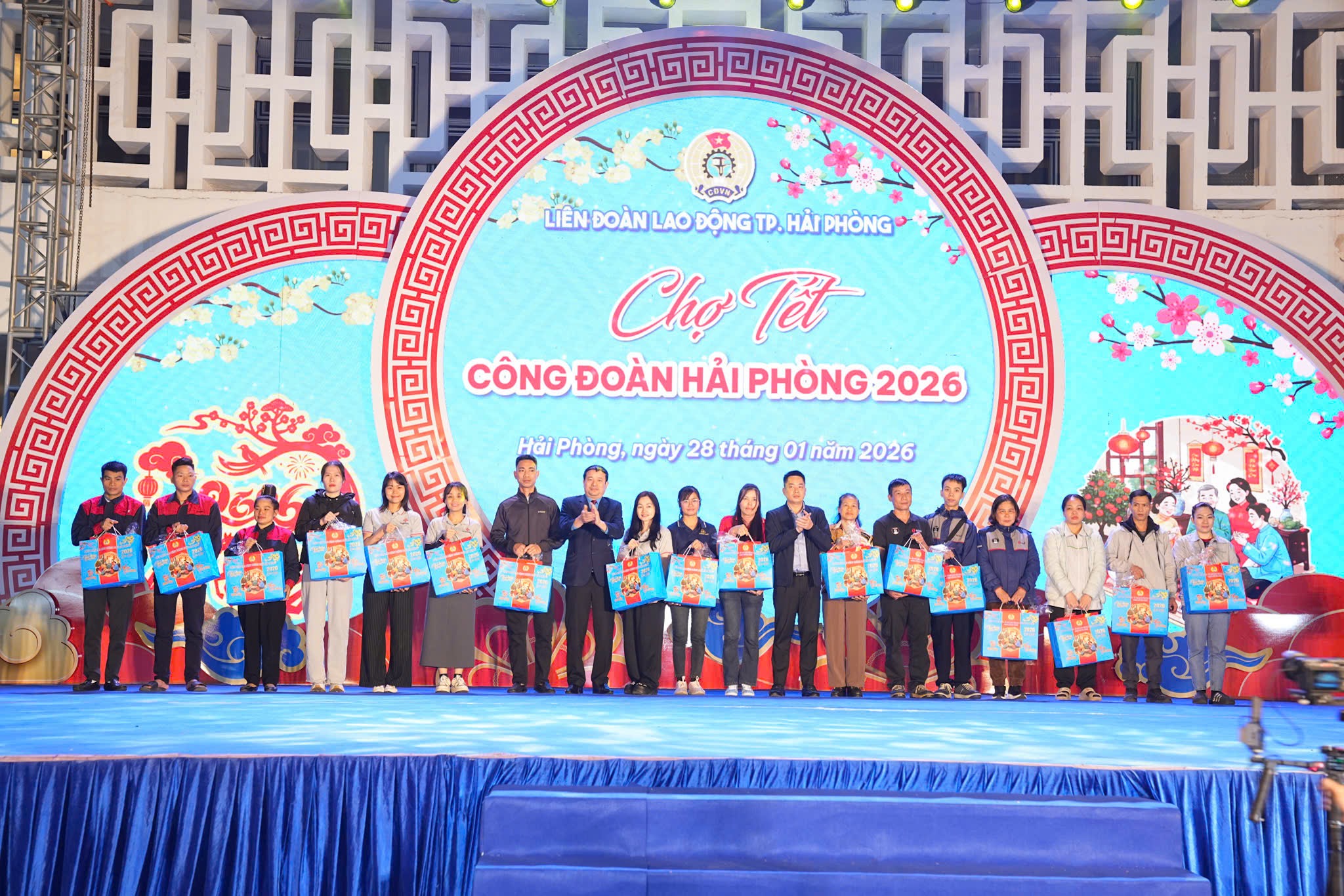 Ngay tại Lễ khai mạc Chợ Tết hôm nay, Tổng LĐLĐ Việt Nam và thành phố Hải Phòng trao tặng quà Tết cho 100 công nhân lao động có hoàn cảnh khó khăn. LĐLĐ thành phố trao tặng 3.000 phiếu mua hàng, mỗi phiếu trị giá 200.000 đồng cho công nhân lao động.