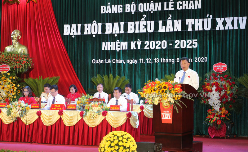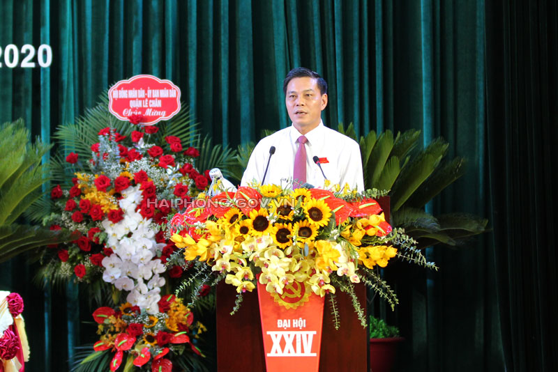 Báo cáo chính trị trình Đại hội đã xác định khá đầy đủ mục tiêu, nhiệm vụ, giải pháp chủ yếu để phát triển quận Lê Chân trong nhiệm kỳ tới, đặc biệt đã bám sát các mục tiêu trong Nghị quyết số 45 của Bộ Chính trị và Chương trình hành động số 76 của Ban Thường vụ Thành ủy. Chủ tịch UBND thành phố nhấn mạnh và lưu ý quận Lê Chân một số nội dung: Đảng bộ quận Lê Chân cần tập trung triển khai, thực hiện có hiệu quả các Nghị quyết của Đảng để phát triển kinh tế – xã hội phù hợp với điều kiện thực tế của quận. Phát triển hạ tầng kinh tế – xã hội, trọng tâm là hệ thống giao thông, chỉnh trang khu vực đô thị cũ, xây dựng chung cư mới thay thế các chung cư cũ, tăng cường xây dựng các khu phức hợp cao tầng, ưu tiên diện tích đất để phát triển công viên, cây xanh và công trình công cộng. Tiếp tục thực hiện tốt công tác an sinh xã hội, quan tâm, chăm lo, hỗ trợ các gia đình có công với cách mạng và các hộ nghèo.