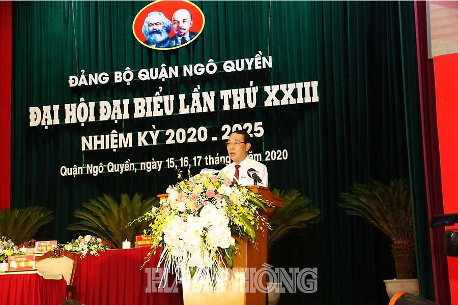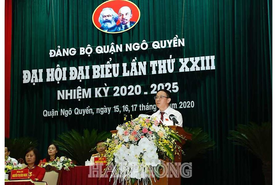 Phát biểu khai mạc đại hội, đồng chí Đào Trọng Đức, Bí thư Quận ủy, Chủ tịch UBND quận Ngô Quyền khẳng định: Nhiệm kỳ 2015÷2020, mặc dù còn gặp nhiều khó khăn, thách thức, song với truyền thống đoàn kết, Đảng bộ quận Ngô Quyền lãnh đạo, chỉ đạo các địa phương, đơn vị thực hiện thành công các mục tiêu, nhiệm vụ, khâu đột phá được Đại hội Đảng bộ quận lần thứ 22 đề ra. Quận hoàn thành 15/15 chỉ tiêu nhiệm kỳ, 6/15 chỉ tiêu hoàn thành vượt kế hoạch, 1/15 chỉ tiêu hoàn thành sớm so với mục tiêu đề ra (chỉ tiêu giảm nghèo). Kinh tế quận duy trì tốc độ tăng trưởng cao, giá trị sản xuất công nghiệp trên địa bàn tăng bình quân 7,54%/năm (vượt chỉ tiêu Nghị quyết Đại hội đề ra), tổng giá trị sản xuất công nghiệp trên địa bàn giai đoạn 2016÷2020 ước đạt 7.450 tỷ đồng, gấp 1,5 lần so với giai đoạn 2011÷2015. Doanh thu các ngành dịch vụ do quận quản lý giai đoạn 2016÷2020 ước đạt 25.075 tỷ đồng, gấp 2,7 lần giai đoạn 2011÷2015, tốc độ tăng bình quân 20,5%/năm (đạt chỉ tiêu Nghị quyết Đại hội đề ra). Quận huy động và sử dụng hiệu quả các nguồn vốn đầu tư phát triển đặc biệt là huy động vốn ngoài Nhà nước; tổng nguồn vốn đầu tư toàn xã hội giai đoạn 2016÷2020 ước đạt 29.460 tỷ đồng, gấp 1,7 lần so với giai đoạn 2011÷2015. Tốc độ tăng thu ngân sách Nhà nước trên địa bàn đạt bình quân 8,2%/năm, tổng thu ngân sách Nhà nước giai đoạn 2015÷2020 đạt 4.795 tỷ đồng, gấp 1,9 lần so với giai đoạn 2010÷2015 (tương đương với 2.183 tỷ đồng); tốc độ tăng thu thuế ngoài quốc doanh đạt bình quân 14%/năm, tổng thu ngoài quốc doanh giai đoạn 2015÷2020 đạt 2.523 tỷ đồng, gấp 2,2 lần so với giai đoạn 2010÷2015 (tương đương 1.362 tỷ đồng).
