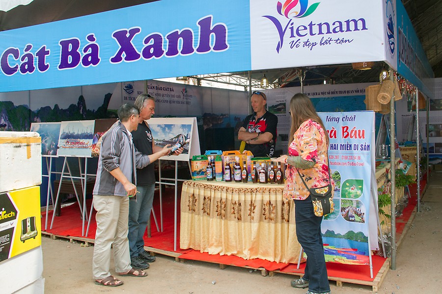 Du khách nước ngoài tham quan gian giới thiệu vẻ đẹp quần đảo Cát Bà tại Hội chợ.