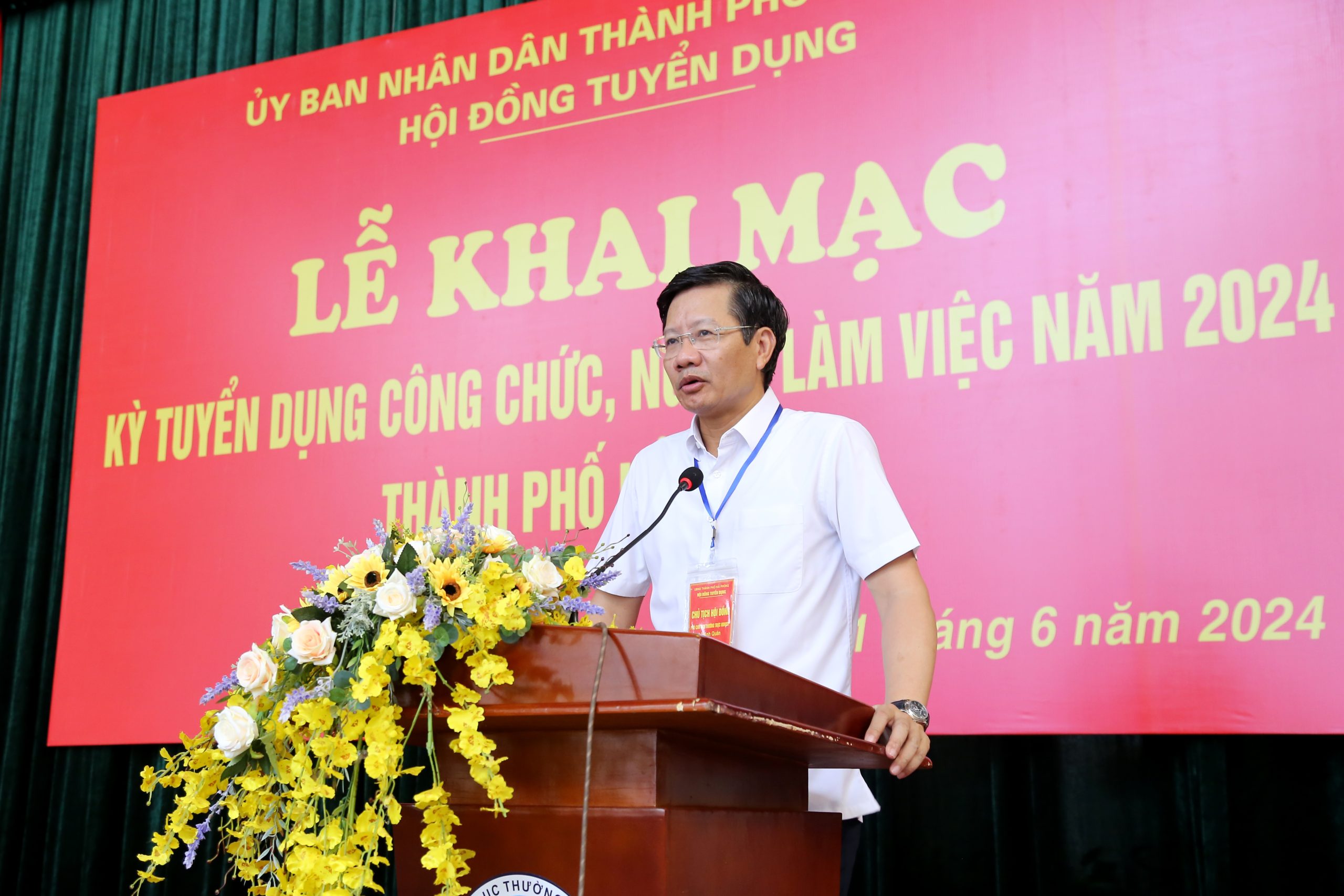 Phát biểu Khai mạc Kỳ thi, Phó Chủ tịch Thường trực UBND thành phố Lê Anh Quân, Chủ tịch Hội đồng tuyển dụng công chức, người lao động năm 2024 thành phố nhấn mạnh: Xây dựng đội ngũ công chức có đủ năng lực, phẩm chất là yếu tố quan trọng quyết định hiệu lực, hiệu quả trong hoạt động công vụ. Để xây dựng đội ngũ công chức đáp ứng yêu cầu trong thực thi công vụ trong thời gian tới, phù hợp với thực tiễn phát triển kinh tế-xã hội của thành phố cần có nhiều hoạt động đồng bộ, trong đó thi tuyển dụng công chức là nội dung quan trọng và cần thiết trong công tác quản lý, sử dụng đội ngũ công chức. Kỳ thi được tổ chức nhằm tuyển chọn công chức đáp ứng tiêu chuẩn, chất lượng để bổ sung nguồn nhân lực cho bộ máy hành chính thành phố. Phó Chủ tịch Thường trực UBND thành phố yêu cầu các thành viên trong Hội đồng thi tuyển, Ban Coi thi, Ban Giám sát cùng các thí sinh dự thi chấp hành nghiêm các nội quy và quy chế thi để Kỳ thi diễn ra nghiêm túc, an toàn, khách quan, công bằng đúng theo quy định của pháp luật hiện hành, đặc biệt không để xảy ra hiện tượng tiêu cực trước, trong và sau Kỳ khi. Phó Chủ tịch Thường trực UBND thành phố Lê Anh Quân chúc các thí sinh bình tĩnh, tự tin để đạt được kết quả tốt nhất.