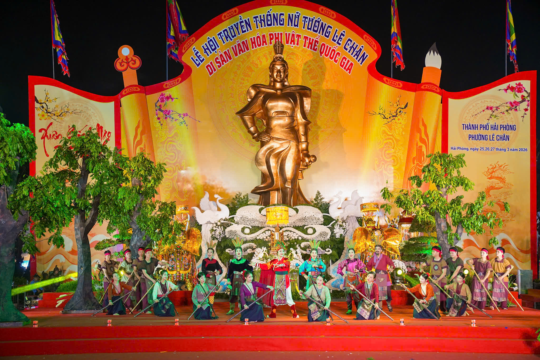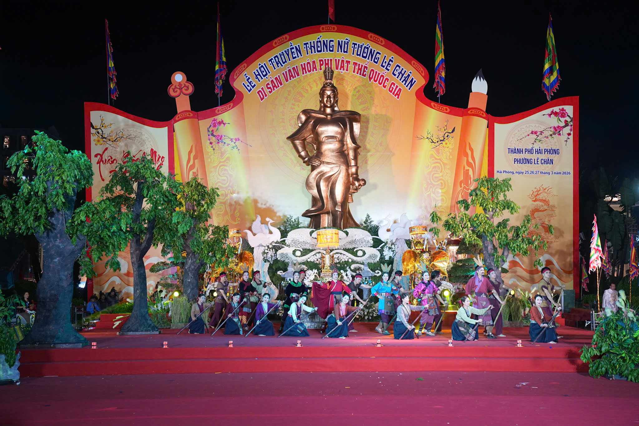 Các đại biểu và Nhân dân đã được thưởng thức Chương trình nghệ thuật “Khúc khải hoàn Nữ tướng Lê Chân” gồm 3 chương, tái hiện hình tượng anh hùng của bà qua hình thức sử thi. Sự kết hợp nghệ thuật truyền thống và hiện đại tạo không gian trang nghiêm, cảm xúc, khắc họa tinh thần yêu nước và khí phách dân tộc.