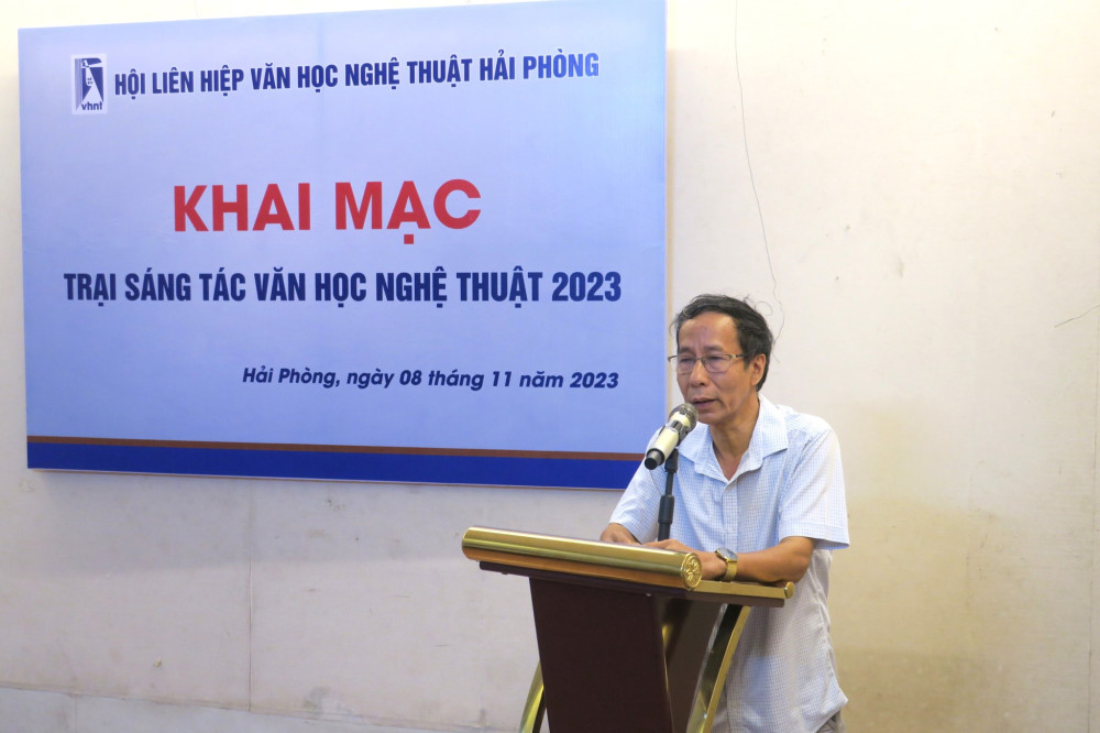 Phát biểu tại chương trình, Chủ tịch Hội Liên hiệp Văn học Nghệ thuật Hải Phòng Tô Hoàng Vũ cho biết, trong thời gian qua các hoạt động văn học, nghệ thuật của thành phố diễn ra rất sôi nổi. Các tác phẩm của các văn nghệ sĩ thành phố được đánh giá cao, có sức lan tỏa tốt, được giới thiệu tới công chúng rộng rãi. Tiếp nối thành công đó, Hội Liên hiệp Văn học Nghệ thuật Hải Phòng tổ chức Trại sáng tác năm 2023 với mong muốn các văn nghệ sĩ thành phố tiếp tục có những tác phẩm chất lượng, góp phần quảng bá những hình ảnh đẹp của thành phố Hải Phòng tới bạn bè trong nước và quốc tế, đồng thời khẳng định vị thế của văn học nghệ thuật Hải Phòng trong lòng công chúng yêu nghệ thuật.