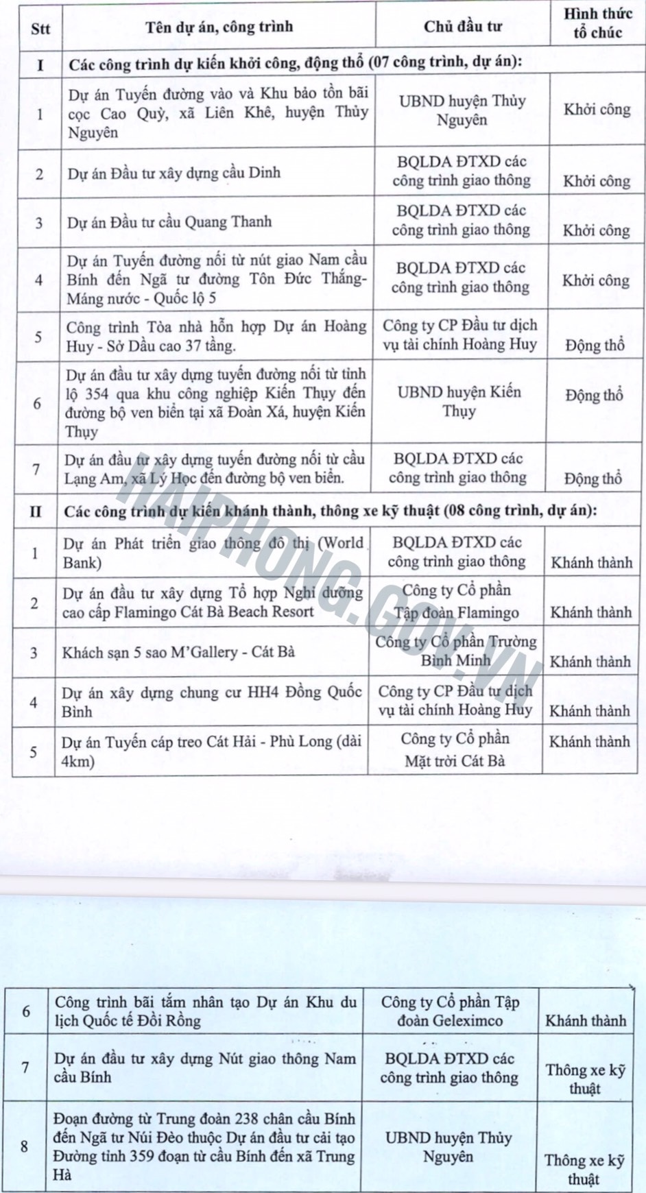 Liên quan đến công tác chuẩn bị cho Lễ khởi công, khánh thành các công trình, dự án trong dịp Kỷ niệm 65 năm Ngày giải phóng Hải Phòng. Chủ tịch UBND thành phố vừa có văn bản đề nghị chủ đầu tư các công trình, dự án dự kiến tổ chức khởi công động thổ và khánh thành trong dịp này, gồm: Công ty Cổ phần Tập đoàn Geleximco, Công ty Cổ phần Mặt trời Cát Bà, Công ty Cổ phần Tập đoàn Flamingo, Công ty Cổ phần Đầu tư dịch vụ tài chính Hoàng Huy, Công ty Cổ phần Trường Bình Minh, Ban Quản lý dự án Đầu tư xây dựng các công trình giao thông Hải Phòng và UBND các quận, huyện khẩn trương hoàn thiện các thủ tục theo quy định, đảm bảo đủ các điều kiện để tổ chức khởi công động thổ, khánh thành các công trình dự án theo đúng kế hoạch.