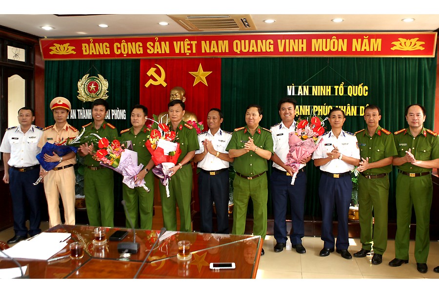 Tại buổi lễ khen thưởng, đại tá Nguyễn Văn Cỏong, Phó giám đốc Công an thành phố và đại tá Nguyễn Văn Thiếu, Phó tư lệnh Cảnh sát biển Vùng 1 trao thưởng, tặng hoa và chúc mừng các tập thể, cá nhân tham gia ban chuyên án.