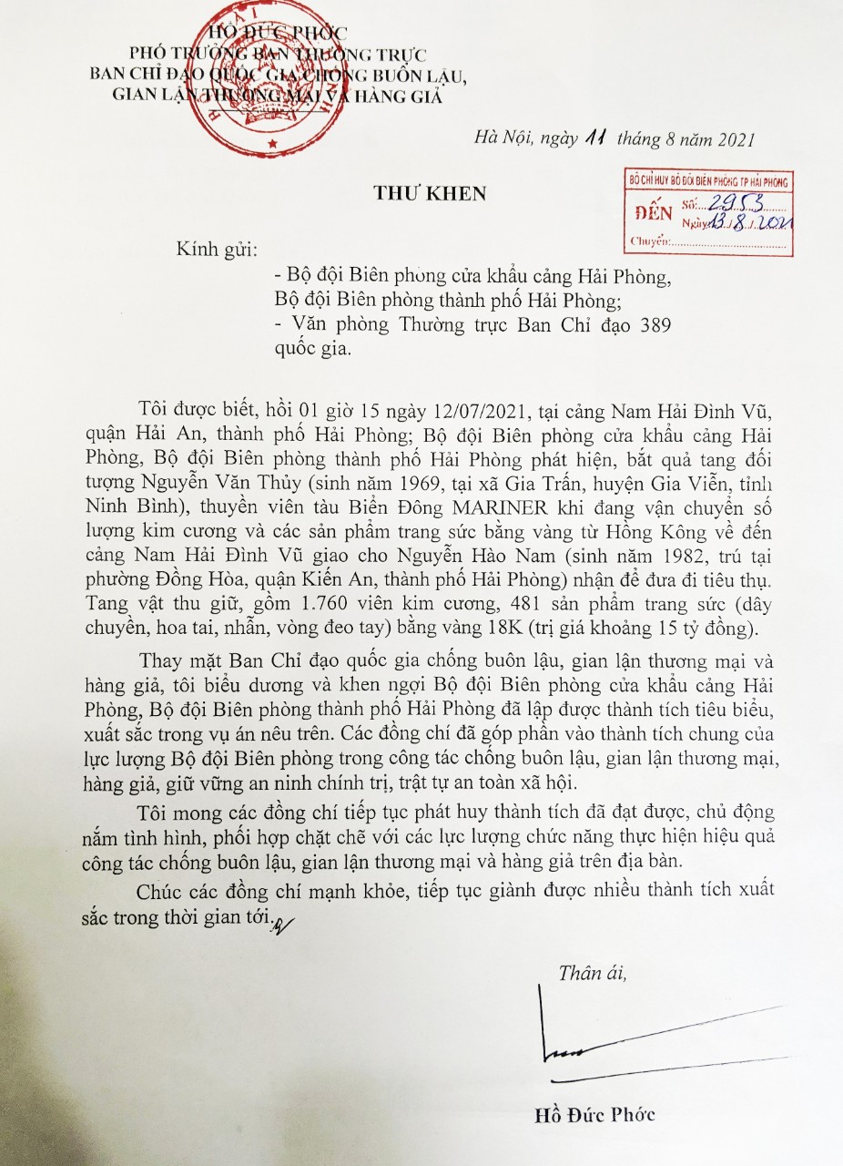 Ghi nhận thành tích lực lượng phá án, đồng chí Hồ Đức Phớc, Phó Trưởng Ban Thường trực Ban Chỉ đạo Quốc gia chống buôn lậu, gian lận thương mại và hàng giả đã gửi Thư khen Bộ đội Biên phòng cửa khẩu cảng Hải Phòng đã lập được thành tích tiêu biểu, xuất sắc trong vụ án nêu trên, góp phần vào thành tích chung của lực lượng Biên phòng trong công tác chống buôn lậu, gian lận thương mại và hàng giả, giữ vững an ninh chính trị, trật tự an toàn xã hội.