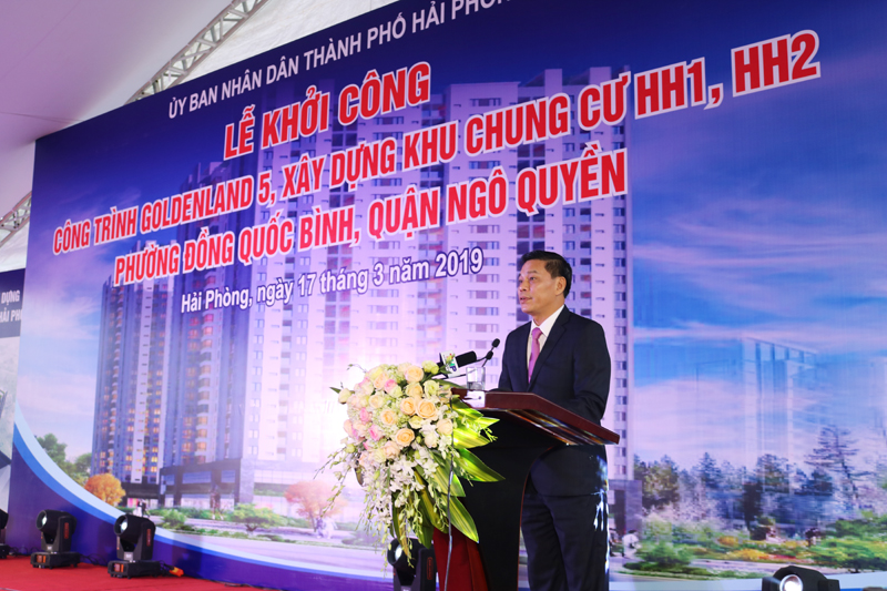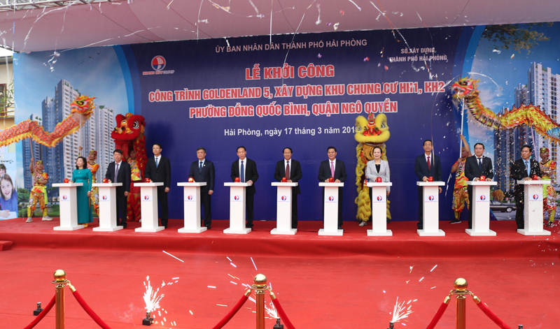 Các đồng chí: Lê Văn Thành, Ủy viên Trung ương Đảng, Bí thư Thành ủy, Chủ tịch HĐND TP; Nguyễn Thị Nghĩa, Phó Bí thư thường trực Thành ủy, Trưởng đoàn ĐBQH Hải Phòng; Nguyễn Văn Tùng, Phó Bí thư Thành ủy, Chủ tịch UBND TP cùng các đại biểu nhấn nút khởi công công trình Goldenland 5, xây dựng chung cư HH1, HH2.