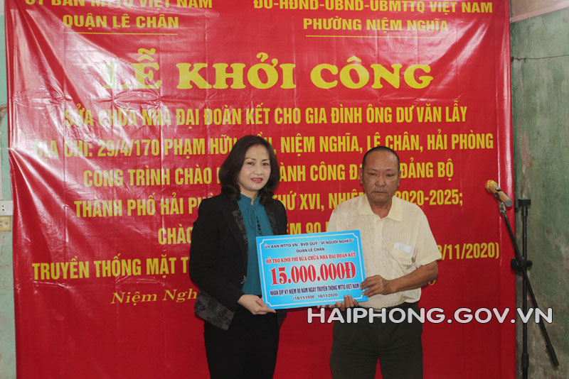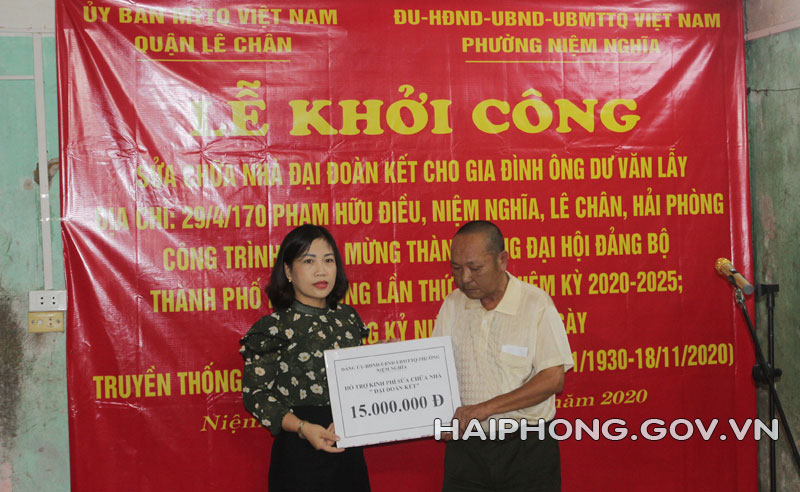 Thực hiện Nghị quyết số 08 ngày 28/2/2019 của Ban Thường vụ Quận ủy Lê Chân về thực hiện Nghị quyết số 05, Nghị quyết số 32 của HĐND thành phố. Sáng 30/10, Ủy ban MTTQ Việt Nam phường Niệm Nghĩa, quận Lê Chân tổ chức khởi công sửa nhà “Đại đoàn kết” cho gia đình hộ cận nghèo. Đây là hoạt động chào mừng thành công Đại hội Đảng bộ thành phố lần thứ XVI, nhiệm kỳ 2020-2025; kỷ niệm 90 năm ngày truyền thống MTTQ Việt Nam (18/11/1930-18/11/2020).