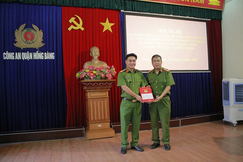 Đại tá Nguyễn Đức Cường- Trưởng CA quận Hồng Bàng bàn giao đơn vị đăng cai giao ban 6 tháng cuối năm tới lãnh đạo CA quận Ngô Quyền