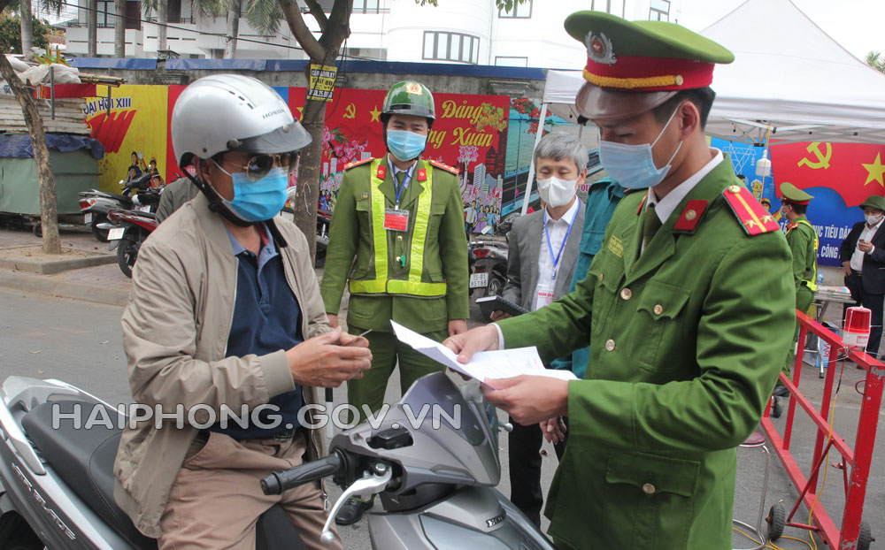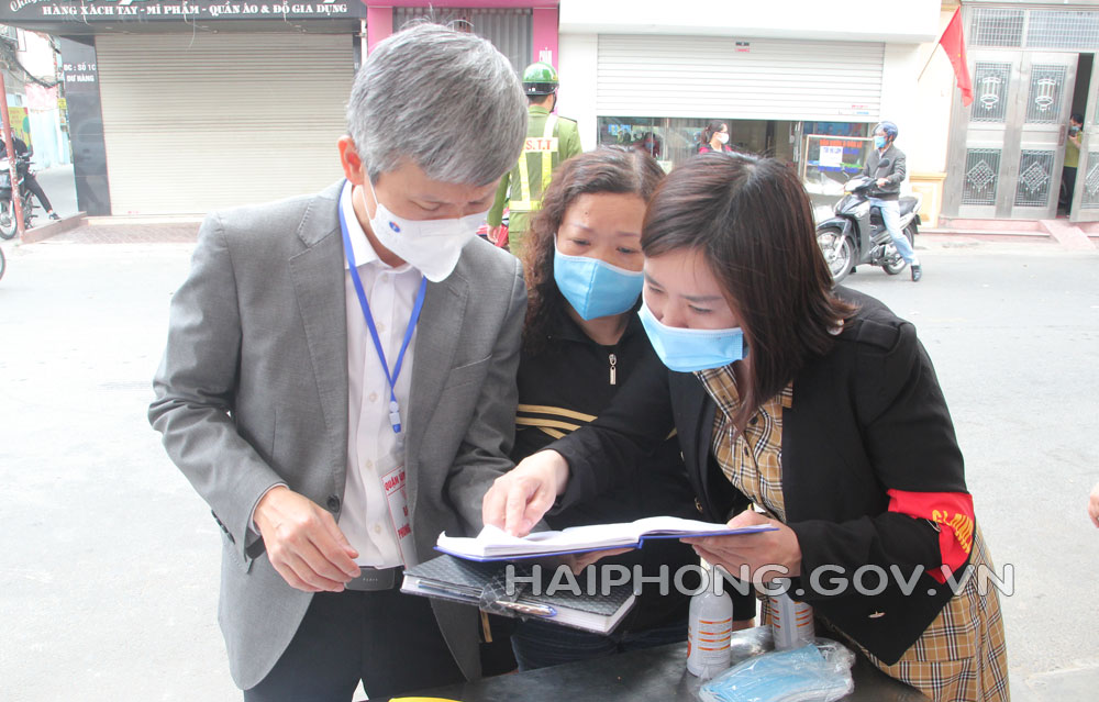 Bí thư Quận ủy Lê Chân kiểm tra sổ sách tại chốt phòng, chống dịch của phường Dư Hàng.