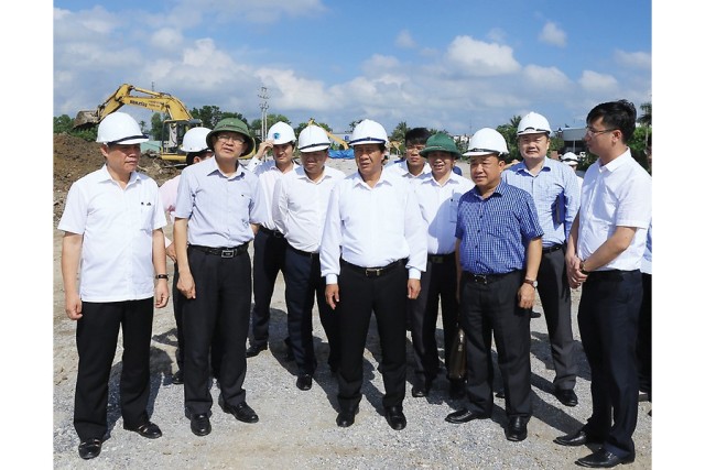 Đồng chí Lê Văn Thành, Ủy viên Trung ương Đảng, Bí thư Thành ủy Chủ tịch HĐND thành phố kiểm tra tiến độ thực hiện Dự án cải tạo, nâng cấp đường từ cầu Lạng Am đến cầu Nhân Mục (quốc lộ 37). Ảnh: Duy Thính