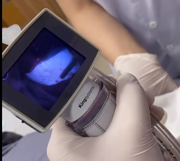 Tiếp nhận bệnh nhân trong tình trạng lơ mơ, kích thích, tím môi, tím đầu chi, ê kíp cấp cứu nhanh chóng khám, đánh giá, chẩn đoán người bệnh bị suy hô hấp cấp do viêm phổi sặc. Ngay lập tức, bệnh nhân được kiểm tra, xác định có dị vật chặn nắp thanh môn, bác sĩ tiến hành gắp dị vật thành công. Đồng thời người bệnh được đặt nội khí quản, an thần, thở máy lúc 18h35’.