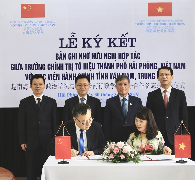 Chiều 30-3, tại Trường Chính trị Tô Hiệu thành phố Hải Phòng đã diễn ra lễ ký kết bản ghi nhớ hữu nghị hợp tác giữa trường Chính trị Tô Hiệu thành phố Hải Phòng, Việt Nam với Học viện Hành chính tỉnh Vân Nam, Trung Quốc. Tới dự buổi lễ, về phía tỉnh Vân Nam có đồng chí Tông Quốc Anh – Ủy viên Ban Thường vụ Tỉnh ủy, Phó Tỉnh trưởng Thường trực tỉnh Vân Nam, Giám đốc Học viện Hành chính Vân Nam, nước Cộng hòa nhân dân Trung Hoa cùng các đồng chí thành viên Đoàn Đại biểu tỉnh Vân Nam. Về phía thành phố Hải Phòng có đồng chí Nguyễn Xuân Bình – Ủy viên Ban Thường vụ Thành ủy, Phó Chủ tịch Thường trực UBND thành phố cùng đại diện các ban, ngành liên quan tham dự, chứng kiến lễ ký kết.