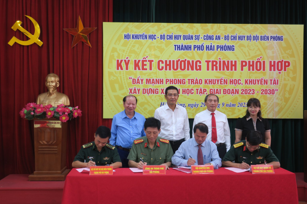 Sáng 29/9, Hội Khuyến học, Bộ Chỉ huy Quân sự, Công an và Bộ Chỉ huy Bộ đội biên phòng thành phố tổ chức Ký kết chương trình phối hợp “Đẩy mạnh phong trào khuyến học, khuyến tài, xây dựng xã hội học tập giai đoạn 2023-2030”.