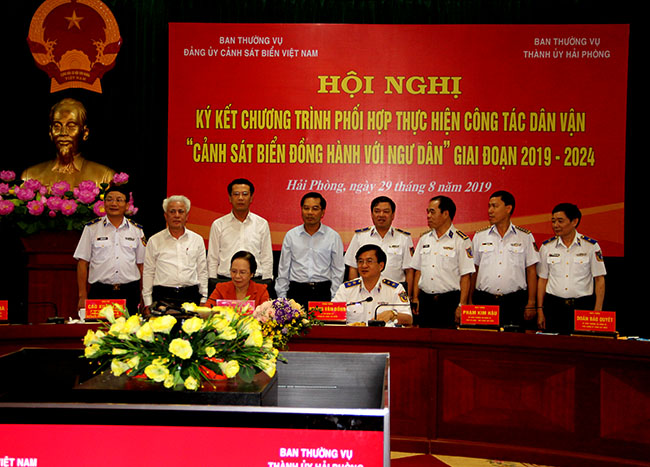 Chiều 29/8, tại Trung tâm hội nghị thành phố, Ban Thường vụ Thành ủy và Ban Thường vụ Đảng ủy Cảnh sát biển Việt Nam tổ chức Hội nghị ký kết Chương trình phối hợp thực hiện công tác dân vận “Cảnh sát biển đồng hành với ngư dân”.