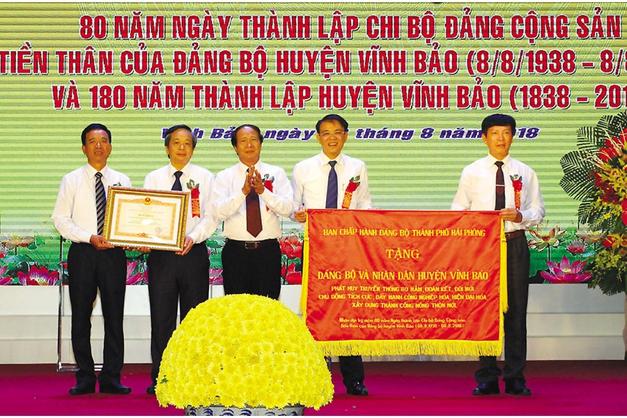 Sáng 8-8, huyện Vĩnh Bảo long trọng tổ chức kỷ niệm 180 năm thành lập huyện (1838-2018), 80 năm thành lập Chi bộ Đảng đầu tiên huyện Vĩnh Bảo (8-8-1938- 8-8-2018).