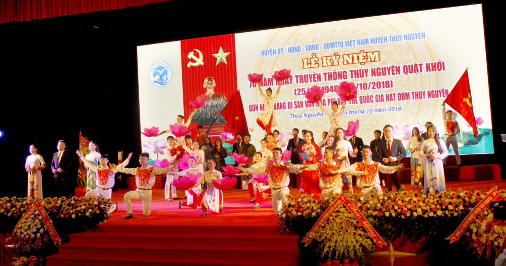 Sáng 25-10, huyện Thủy Nguyên long trọng tổ chức kỷ niệm 70 năm Ngày truyền thống Thủy Nguyên quật khởi (25-10-1948 – 25-10-2018) và đón nhận bằng Di sản văn hóa quốc gia hát Đúm Thủy Nguyên.