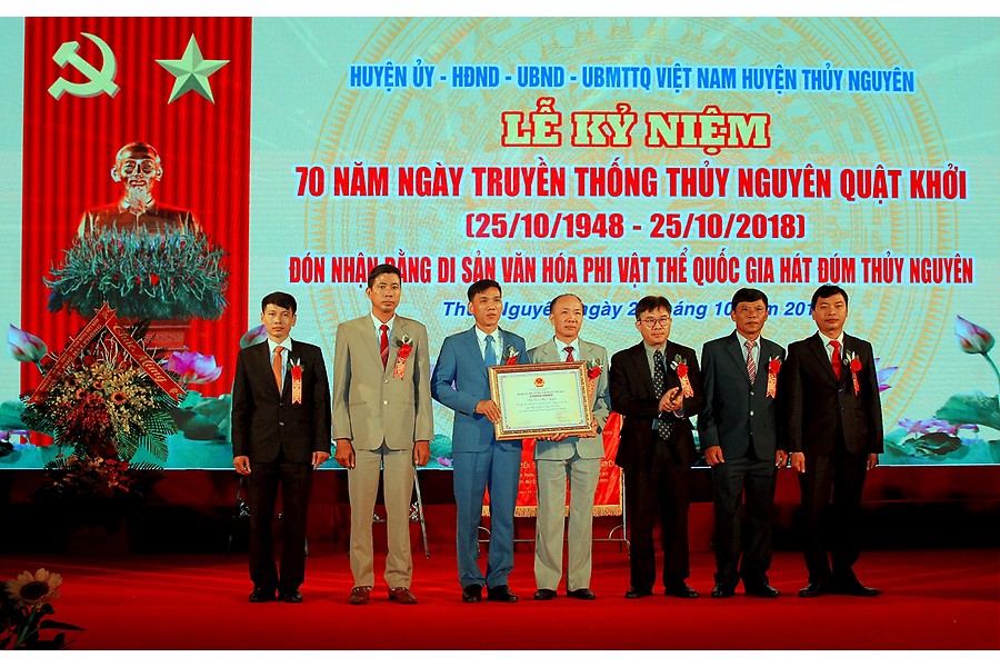 Nhân dịp này, đồng chí Lê Văn Thành, Bí thư Thành ủy, Chủ tịch HĐND thành phố trao bằng khen của Thủ tướng Chính phủ và bức trướng của Thành ủy, HĐND, UBND, Ủy ban MTTQ Việt Nam thành phố với dòng chữ: “Phát huy truyền thống anh hùng quật khởi đoàn kết, đổi mới, sáng tạo xây dựng huyện phát triển nhanh, giàu đẹp, văn minh” tặng Đảng bộ và nhân dân huyện Thủy Nguyên. Đại diện lãnh đạo Cục Di sản văn hóa trao bằng công nhận hát Đúm Thủy Nguyên là Di sản văn hóa phi vật thể quốc gia.