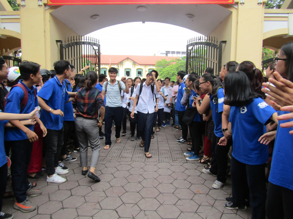 Những thí sinh đầu tiên ra khỏi điểm thi trong sự chào đón của thanh niên tình nguyện và người thân