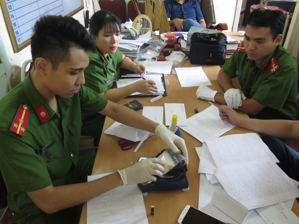 Các chiến sỹ Phòng kỹ thuật hình sự lấy mẫu giám định phục vụ chuyên án triệt phá ổ nhóm buôn bán ma túy (ảnh: Phan Tuấn)