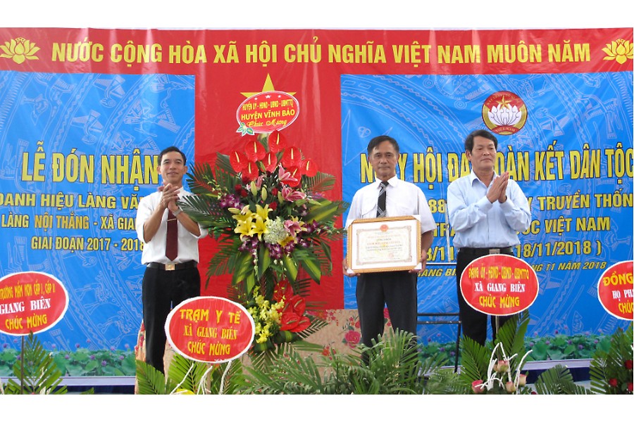 Chiều 16-11, làng Nội Thắng (xã Giang Biên, huyện Vĩnh Bảo) tổ chức đón nhận danh hiệu làng Văn hóa giai đoạn 2017-2018 và tổ chức Ngày hội Đại đoàn kết dân tộc nhân kỷ niệm 88 năm Ngày truyền thống Mặt trận Tổ quốc Việt Nam (18-11-1930 – 18-11-2018).