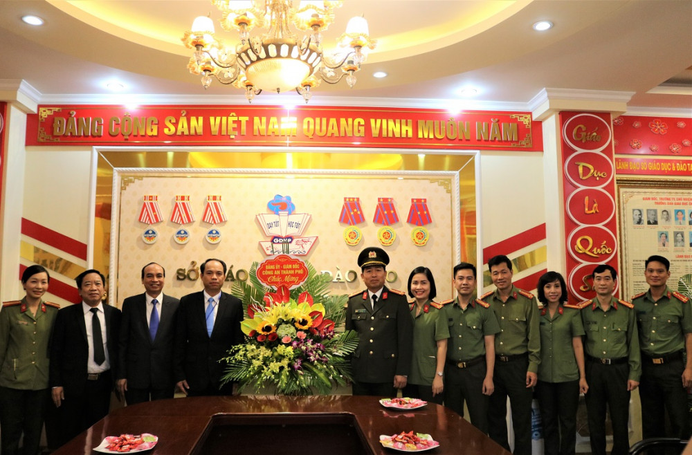 Tại Sở Giáo dục và Đào tạo thành phố, thay mặt Đảng ủy – Ban giám đốc CATP, Đại tá Vũ Thanh Chương tặng hoa chúc mừng và gửi lời chúc sức khỏe của Đảng ủy, Ban Giám đốc cũng như cán bộ, chiến sỹ Công an thành phố đến lãnh đạo Sở Giáo dục và Đào tạo cùng các thầy cô giáo các trường học trên địa bàn thành phố.