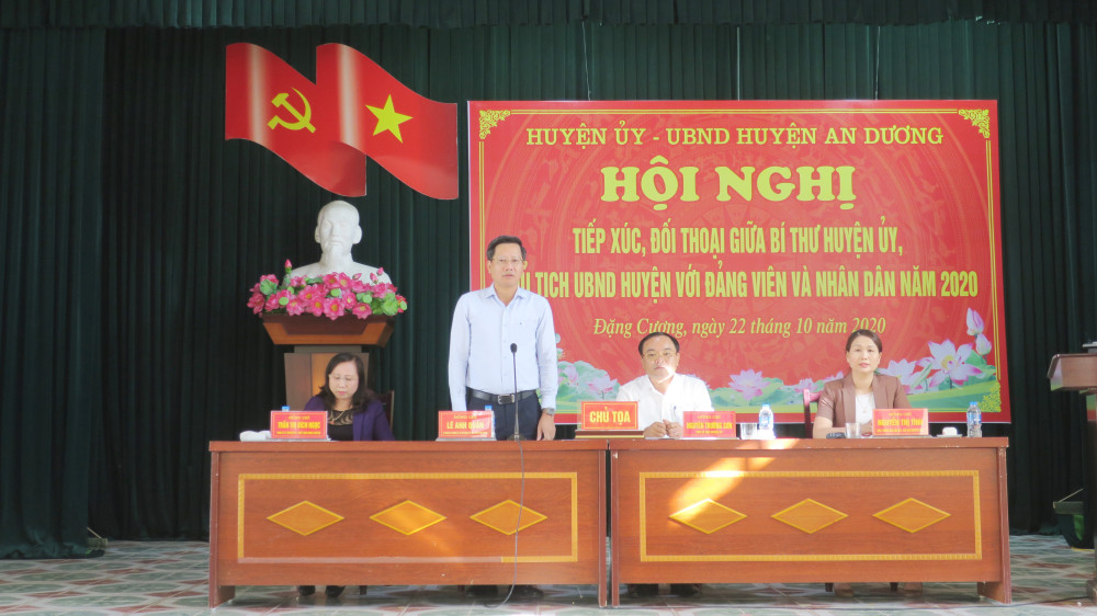Sáng 22/10, tại Nhà Văn hóa xã Đặng Cương, huyện An Dương, đồng chí Lê Anh Quân, Ủy viên Ban Thường vụ Thành ủy, Bí thư Huyện ủy, Chủ tịch UBND huyện cùng các đồng chí lãnh đạo Huyện ủy, HĐND, UBND, Ủy ban MTTQ Việt Nam huyện đối thoại với hơn 150 đảng viên và nhân dân các xã Đồng Thái, Hồng Thái, Quốc Tuấn, Đặng Cương, Lê Lợi, An Đồng, Nam Sơn, thị trấn An Dương thuộc huyện.