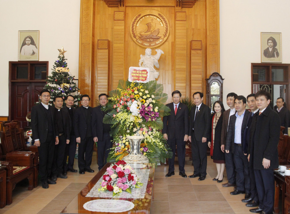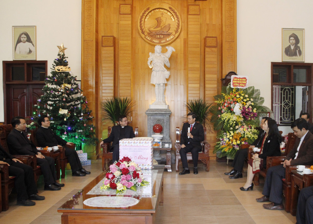 Tại Tòa Giám mục Hải Phòng, Phó Chủ tịch Thường trực UBND thành phố Lê Anh Quân thay mặt lãnh đạo thành phố gửi lời chúc sức khỏe, bình an, thịnh vượng, đón Giáng sinh an lành đến Tòa Giám mục Hải Phòng, cùng toàn thể các linh mục, chức sắc, tín đồ Công giáo và giáo dân toàn trong giáo phận.