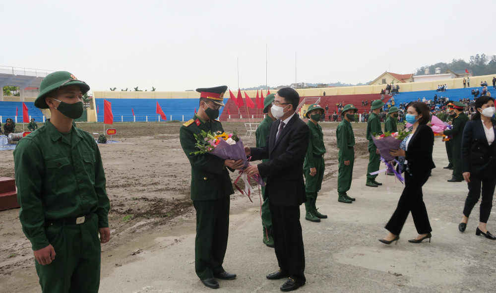Tại lễ giao quân, đồng chí Nguyễn Văn Tùng, Phó Bí thư Thành ủy, Chủ tịch UBND thành phố cùng các đồng chí lãnh đạo tặng hoa chúc mừng các tân binh, đơn vị nhận quân và động viên các tân binh cố gắng học hỏi, rèn luyện, hoàn thành tốt huấn luyện và nhiệm vụ Tổ quốc giao.