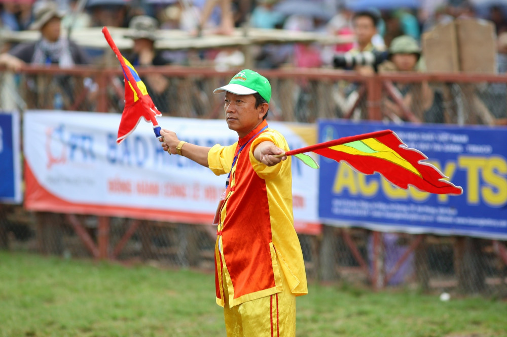 Trọng tài ra hiệu lệnh đưa các ông trâu vào sới chọi (Ảnh: Phan Tuấn)