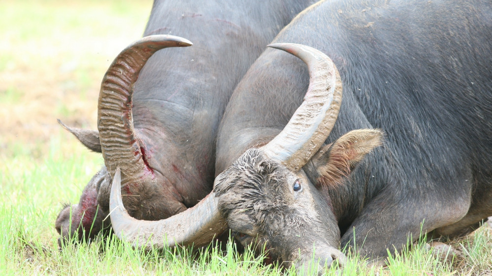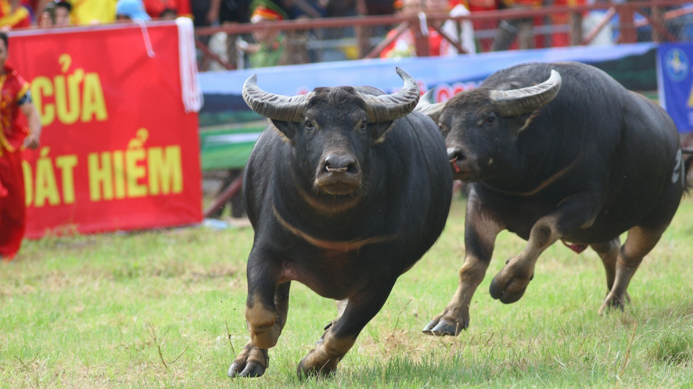 Ông trâu số 12 và ông trâu số 14 có màn tranh đấu quyết liệt (Ảnh: Thủy Chung)