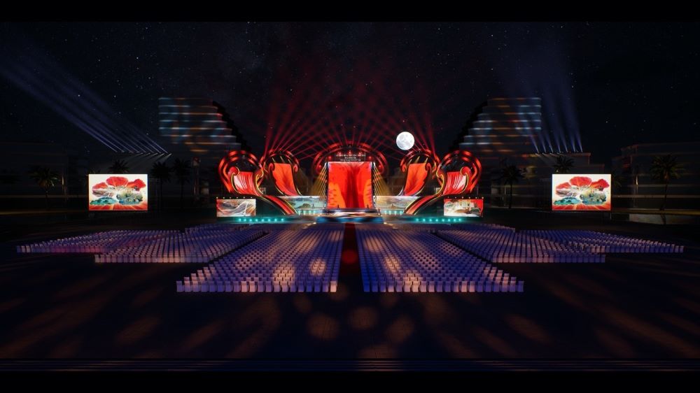 Led trung tâm phác hoạ dải cánh hoa lớn nhất của bông hoa phượng. Mặt sàn sân khấu minh hoạ nhuỵ bông hoa phượng với khối sàn tròn ở tâm, khối hình này cũng là chất liệu Led. Về mặt thấu thị, tạo chiều sâu không gian, đồng thời qua các tiết mục có thể liên tục biến đổi cảnh quan nền như: mặt biển, thềm cát hay hè phố… đặc biệt khi kết hợp cùng công nghệ AR (viết tắt của Augmented Reality – thực tế ảo tăng cường) ngay trong show diễn.