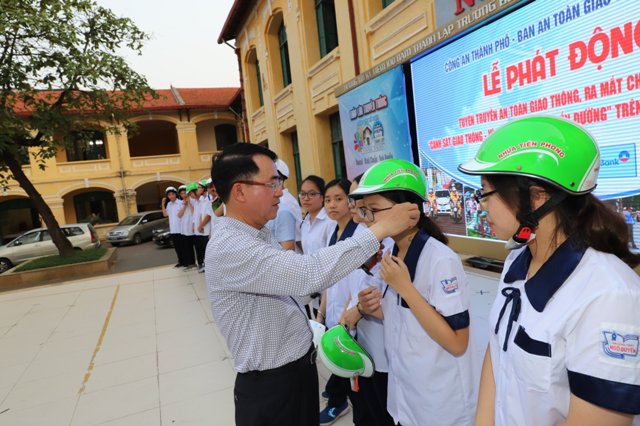 Lãnh đạo thành phố trao mũ bảo hiểm cho đại diện các em học sinh.