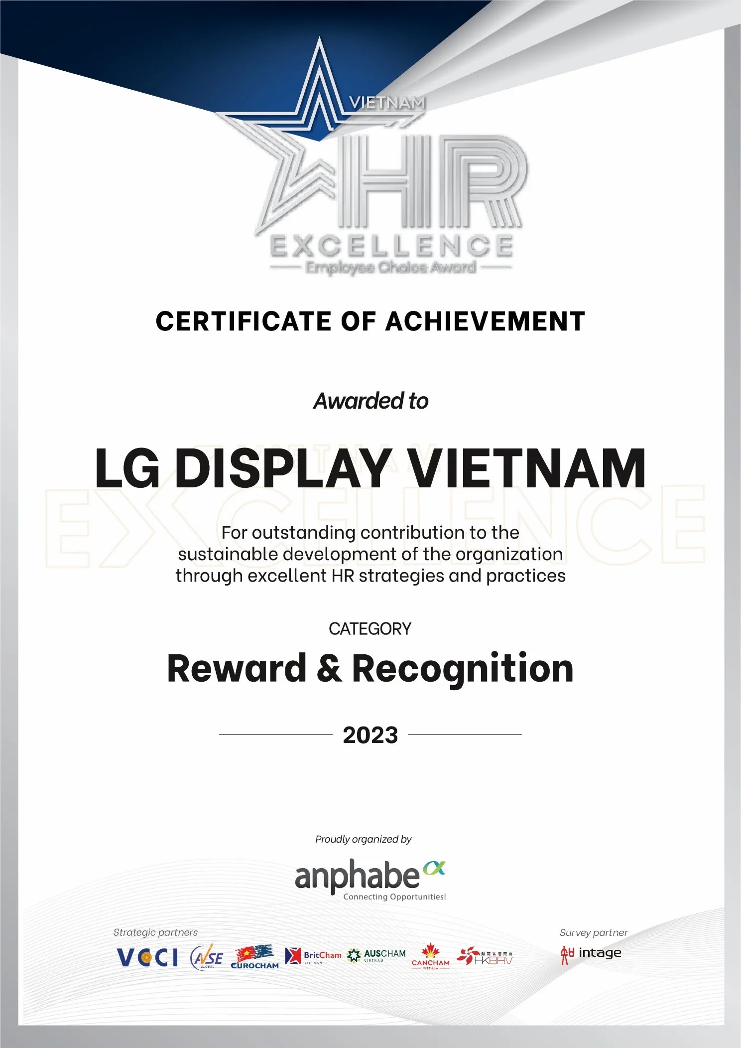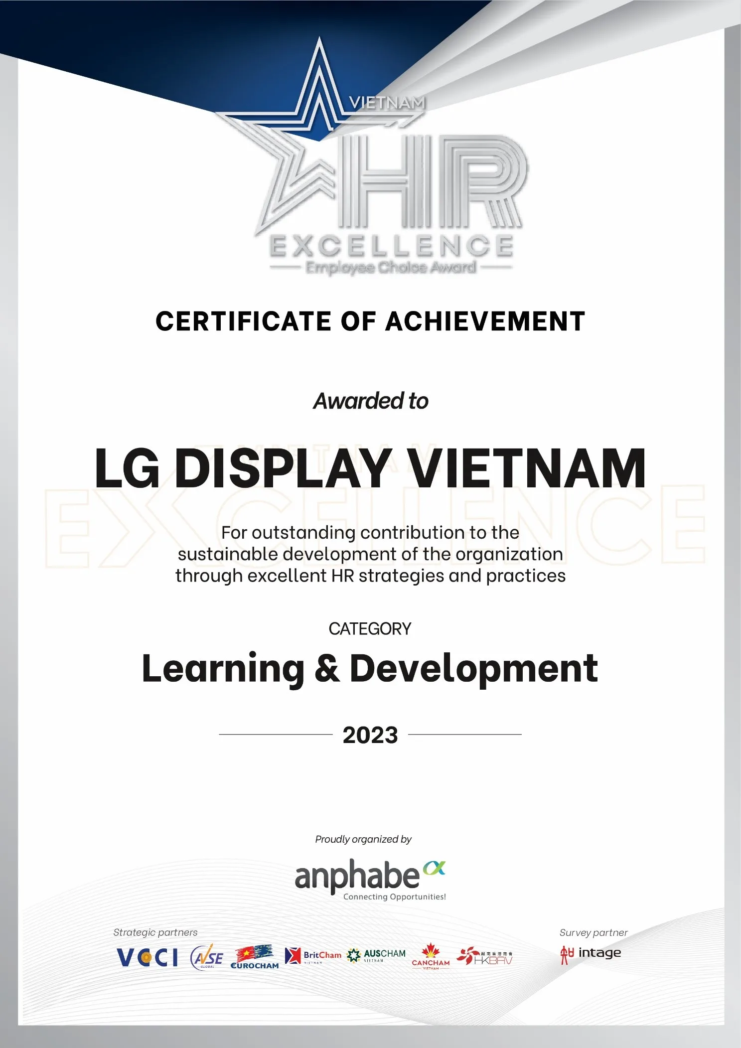 Công ty LG Display đã tham gia 02 hạng mục: Đào tạo và Phát triển và Ghi nhận & amp. Bằng sự nỗ lực và xuất sắc, LG Display đã vinh hạnh được tôn vinh và dành giải thưởng chiến thắng trong cả 02 hạng mục.