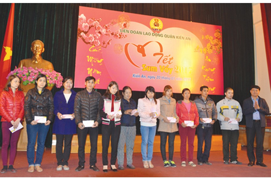 Các cấp Công đoàn quận Kiến An tranh thủ mọi nguồn lực để chăm lo người lao động, nhất là những người có hoàn cảnh khó khăn. Đoàn viên đóng góp kinh phí và vận động xây dựng, sửa chữa 12 ngôi nhà Mái ấm Công đoàn với tổng số tiền hỗ trợ 340 triệu đồng; trợ cấp khó khăn hơn 900 lượt cán bộ, viên chức, lao động với số tiền hơn 400 triệu đồng cùng với nhiều hoạt động có ý nghĩa như: chương trình “Tết sum vầy”, “Tháng công nhân”… để lại nhiều tình cảm tốt đẹp của mỗi đoàn viên đối với tổ chức Công đoàn. Ngoài ra, LĐLĐ quận vận động cán bộ, viên chức, người lao động ủng hộ chương trình “ Tấm lưới nghĩa tình”, hưởng ứng Quỹ “Đền ơn đáp nghĩa”, Vì người nghèo và thực hiện đề án “Công nhân viên chức lao động thành phố chung sức xây dựng nông thôn mới giai đoạn 2013-2015, định hướng đến 2020” tại huyện Tiên Lãng và 2 phường của quận Kiến An. Các cấp Công đoàn cũng tổ chức nhiều hoạt động văn hóa văn nghệ, thể dục thể thao, góp phần nâng cao đời sống tinh thần người lao động, động viên đoàn viên thi đua sản xuất, tăng cường đoàn kết, giao lưu giữa các công đoàn cơ sở.