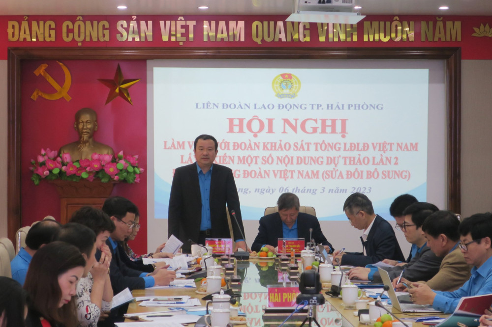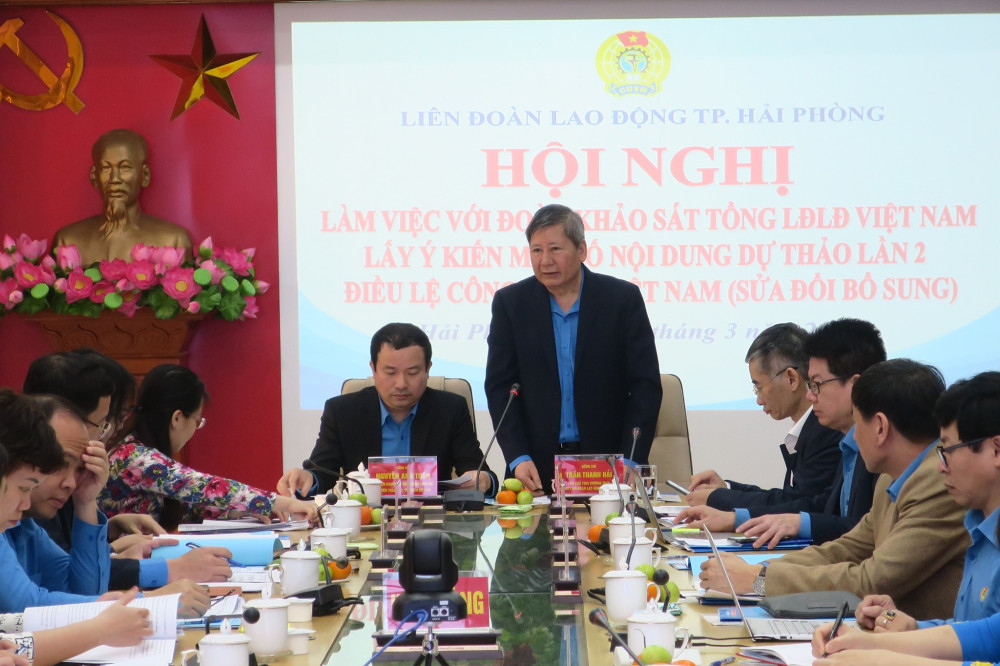 Sáng 6/3, Đoàn khảo sát của Tổng Liên đoàn Lao động Việt Nam làm việc với Ban Thường vụ LĐLĐ thành phố Hải Phòng lấy ý kiến một số nội dung Dự thảo lần 2-Điều lệ Công đoàn Việt Nam (sửa đổi, bổ sung). Đồng chí Trần Thanh Hải, Phó Chủ tịch Thường trực Tổng LĐLĐ Việt Nam chủ trì Hội nghị.