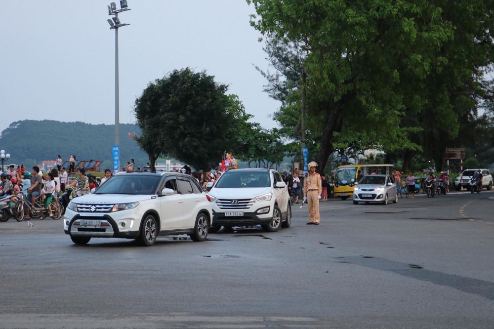 Lực lượng cảnh sát giao thông hướng dẫn các phương tiện lưu thông tại khu vực quảng trường biển (Ảnh: Trần Sơn)