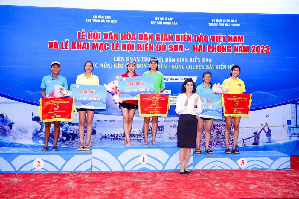 Đồng chí Phạm Thị Tô Trang, Phó Giám đốc Sở Văn hóa và Thể thao trao giải cho các đội thi đấu bộ môn Bóng chuyền bãi biển.