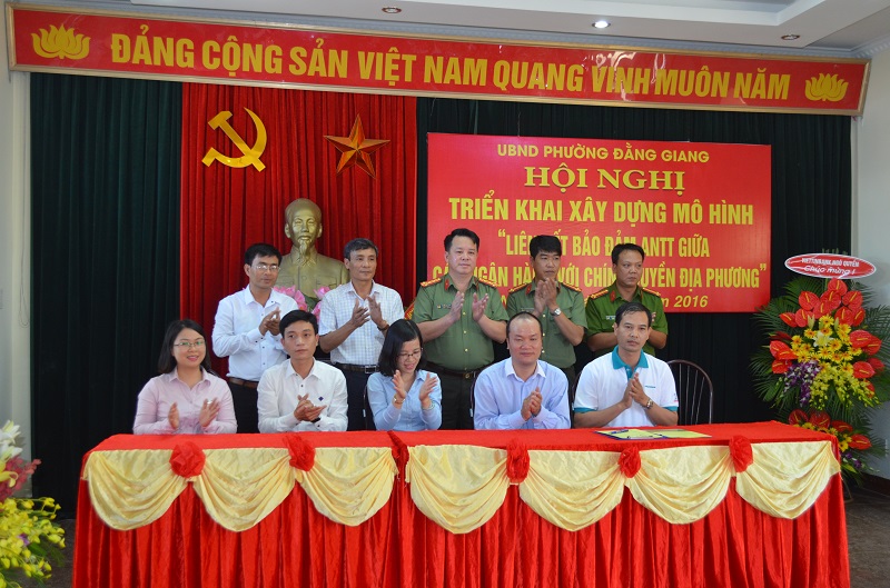 Đại tá Nguyễn Quốc Hùng, Phó Giám đốc CATP chứng kiến lễ ký cam kết giữa các ngân hàng và chính quyền phường Đằng Giang năm 2016