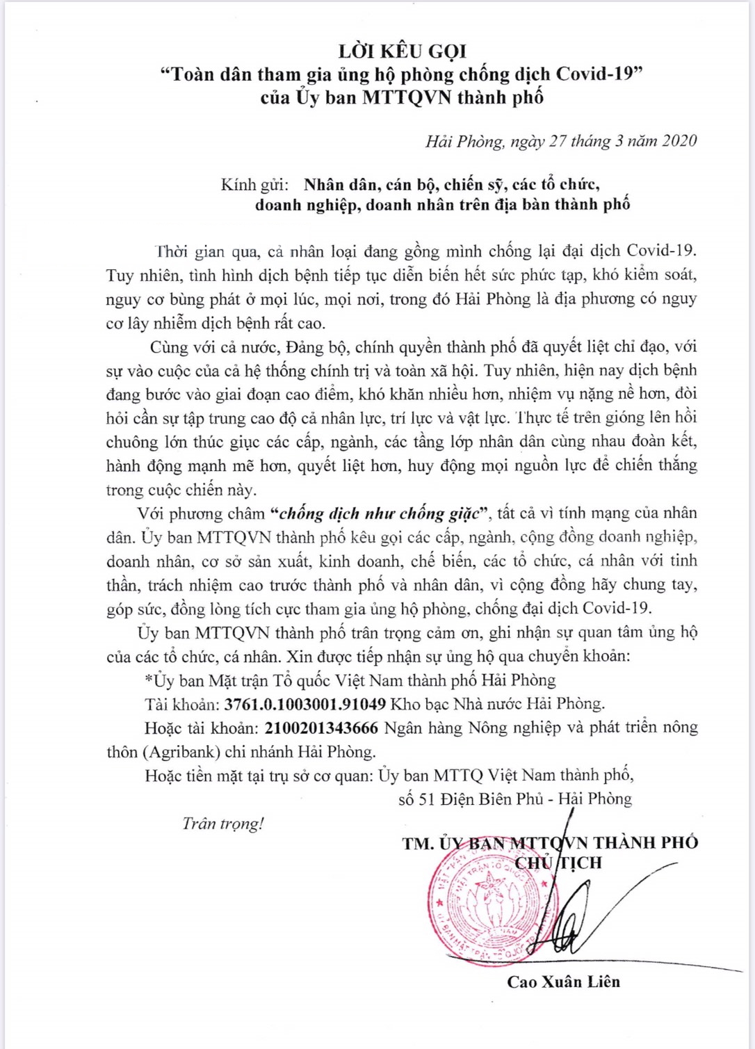 Ủy ban MTTQ Việt Nam thành phố Hải Phòng vừa có Lời kêu gọi gửi tới nhân dân, cán bộ, chiến sỹ, các tổ chức, doanh nghiệp, doanh nhân trên địa bàn thành phố tham gia ủng hộ phòng chống dịch COVID-19.