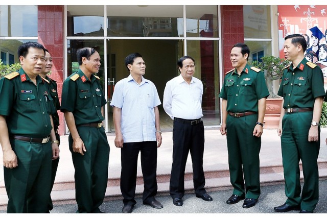 Các đồng chí: Lê Văn Thành, Ủy viên Trung ương Đảng, Bí thư Thành ủy, Chủ tịch HĐND thành phố, Bí thư Đảng ủy quân sự thành phố; Trung tướng Vũ Hải Sản, Ủy viên Trung ương Đảng, Tư lệnh Quân khu Ba; cùng lãnh đạo Đảng ủy Quân sự thành phố trao đổi tại hội nghị.