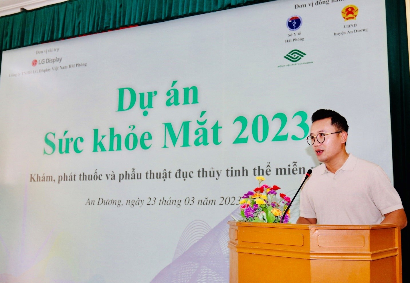 Phát biểu tại buổi lễ, ông Tạ Duy Khánh, Phó Giám đốc đối ngoại Công ty TNHH LG Display Việt Nam Hải Phòng chia sẻ: Với đặc thù là một công ty sản xuất màn hình, LG Display Việt Nam Hải Phòng rất chú trọng đến Sức khỏe mắt của cộng đồng. Năm 2017, tại huyện đảo Cát Hải chúng tôi đã tổ chức chương trình khám, phát thuốc cho hơn 300 người cao tuổi trong đó có 30 người được chỉ định phẫu thuật đục thủy tinh thể. Tiếp nối thành công của chương trình nhân văn đó, năm nay chúng tôi tiếp tục thực hiện “Dự án Sức khỏe mắt” năm 2023 với mong muốn cải thiện thị lực cho người cao tuổi trên địa bàn huyện An Dương. Trong tương lai chúng tôi sẽ nỗ lực để mở rộng dự án này và triển khai trên nhiều địa phương trên địa bàn thành phố Hải Phòng. Công ty LGDVH mong rằng sẽ có thêm nhiều cơ hội thực hiện những dự án đem lại giá trị to lớn cho người dân.