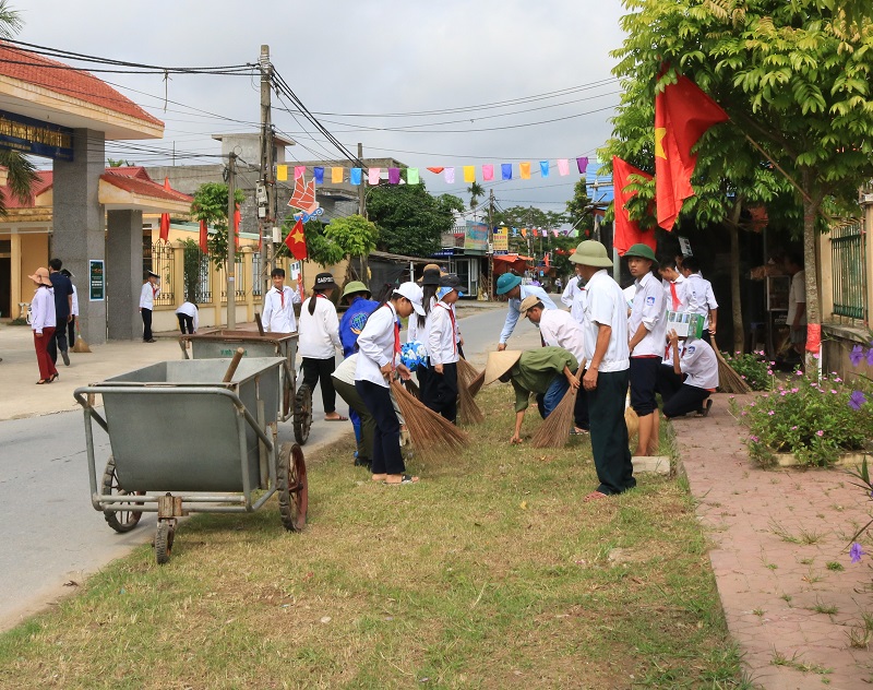 Các em học sinh tham gia dọn dẹp vệ sinh trên địa bàn