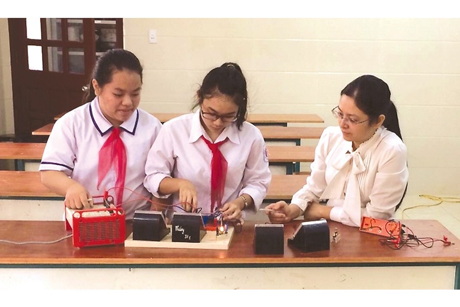 Cô Chang hướng dẫn học sinh Trường THCS Lương Khánh Thiện tham gia cuộc thi khoa học kỹ thuật cấp thành phố.