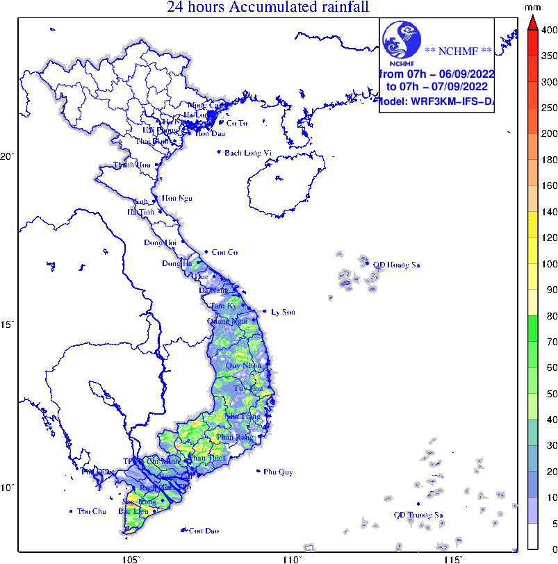 Dự báo: Ngày và đêm 6/9, ở khu vực từ Thừa Thiên Huế đến Bình Thuận, Tây Nguyên và Nam Bộ có mưa rào và dông, cục bộ có mưa to với lượng mưa từ 20-40mm, có nơi trên 70mm (thời gian mưa dông tập trung vào chiều và tối).