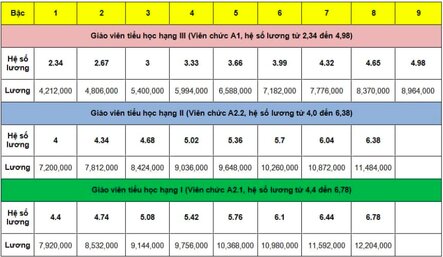 Mức lương giáo viên tiểu học cao nhất hiện nay là 12.204.000 đồng/tháng. Do đó, bảng lương giáo viên tiểu học dự kiến mức cao nhất sẽ vượt 12,2 triệu đồng/tháng khi thực hiện cải cách tiền lương từ ngày 1.7.
